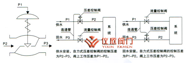 現(xiàn)以安裝在回水管道上的自力式壓 差控制閥為例說(shuō)明其工作原理。當(dāng)供水壓力這增大或減小時(shí),信號(hào)由連接管傳入膜片上腔,帶動(dòng)閥芯下移或上移,使閥座的流通面積減小或增大。P2-P3也增大或減小,直至P1-P2保持原值恒定。當(dāng)回水壓力P3增大或減小的瞬間同閥座流向出品的流速降低或升高,膜片下壓力P2也在這個(gè)瞬間增高或降低,帶動(dòng)閥芯上移或下移,直至膜片的受力重新平衡。P2恢復(fù)恒定,從而保證了被控系統(tǒng)的供回水間壓差基本不變。